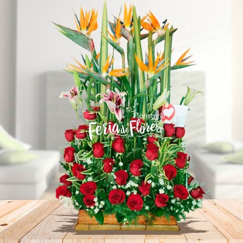 Alegra el día a ese ser especial, envíale flores y llena su vida de felicidad, obséquiale este Arreglo Floral Exótico Tucana que se ha elaborado sobre una base de madera, con