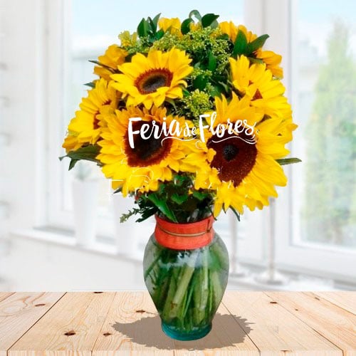 Los elementos que componen el Jarrón con 12 Girasoles tales como, bases, adornos, cajas, vinos, chocolates, globos, peluches, flores, frutas y colores, pueden diferir de la imagen de referencia, y estos están sujetos a cualquier cambio que se requiera según la disponibilidad, sin embargo hacemos nuestro mejor esfuerzo para complacer a nuestros clientes aún en los más mínimos detalles.