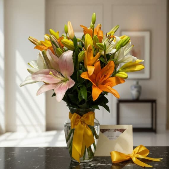 Entre las flores más bellas y representativas de nuestro país se encuentran este jarrón con lirios, envía este hermoso jarrón con